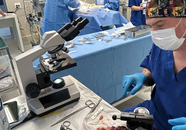 Trabalhamos com patologistas especializados e comunicação direta durante a cirurgia, garantindo decisões assertivas no momento mais crítico do tratamento oncológico do seu Pet.